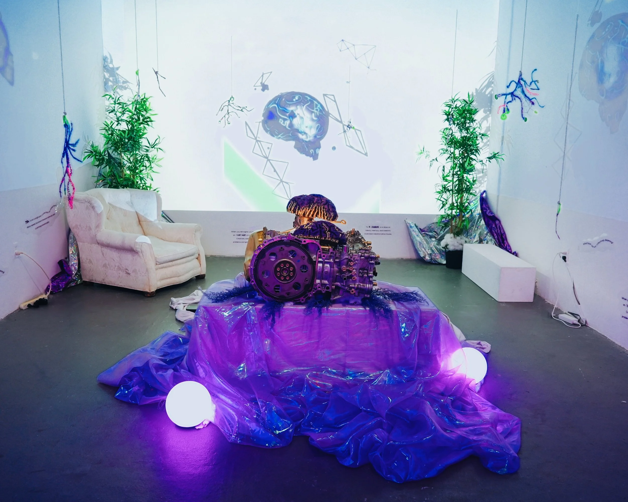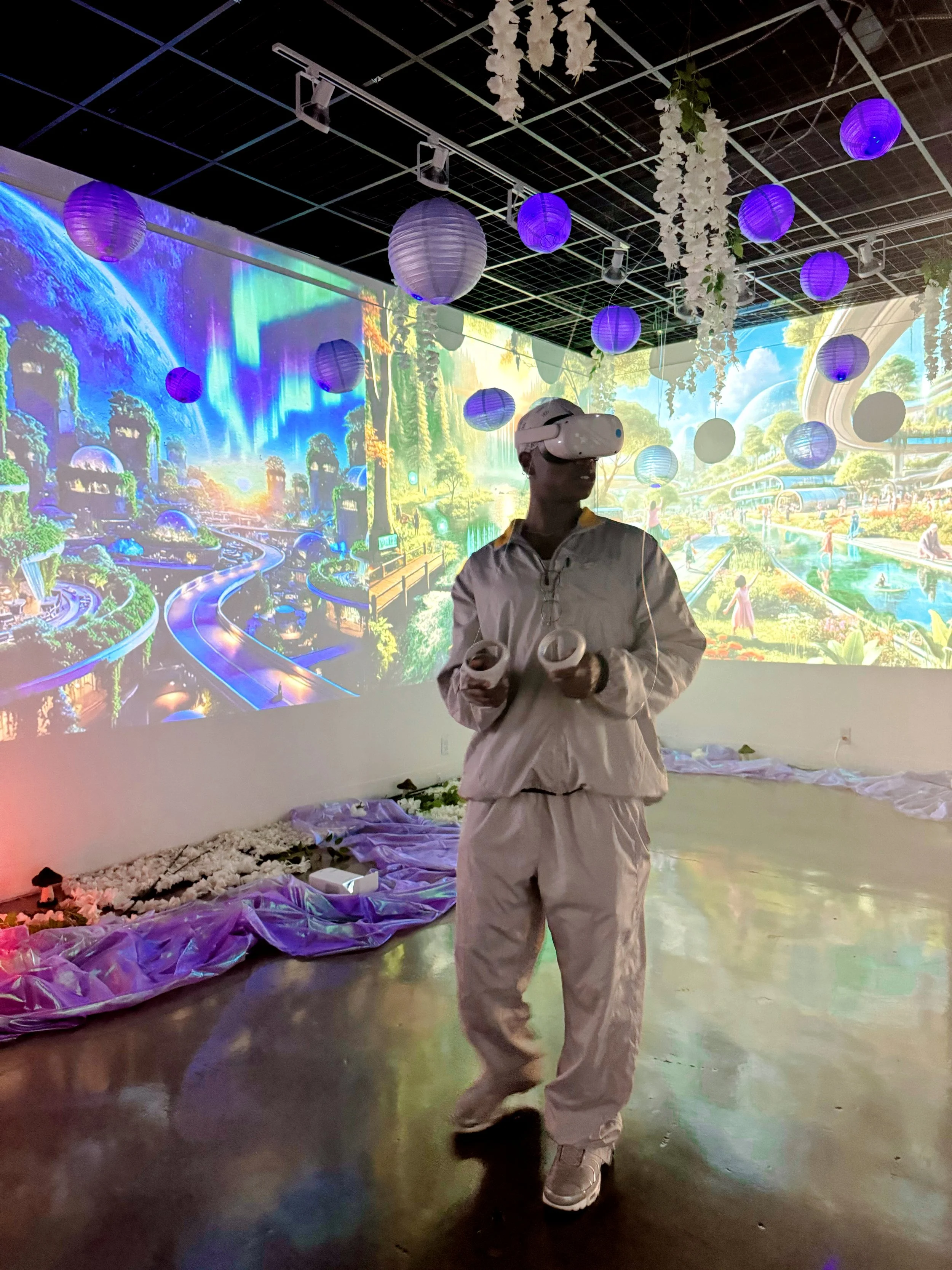An immersive exhibit at California Institute of the Arts showcasing AI-driven visions of sustainable futures through projection mapping, virtual reality, biophilic design, and interactive displays.